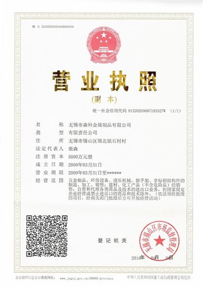 無錫市森科金屬製品有限公司營業執照